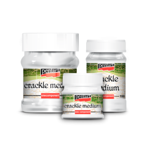 PENTART’s single-component crackle varnish lends a touch of antiquity to any surface, reminiscent of cracking paint. Use an acrylic paint on the surface to be decorated; once dry apply the crackle medium. Once the crackle medium has dried, paint the surface again with an acrylic paint of a different color than the original layer. The second layer of paint applied will crack as it is drying, thanks to the crackle varnish. The base colon applied initially will peek through the resulting cracks. The pattern of cracks depends on the thickness of the layers and on the technique used to apply the paint layers.