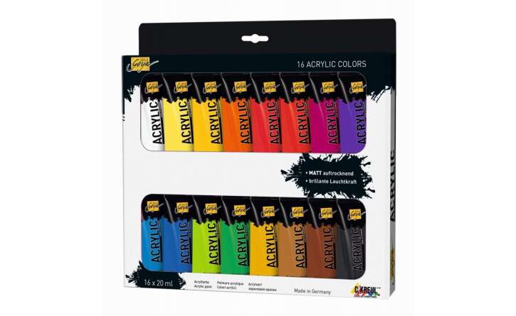 20 ml (White, Citron, Cadmium Yellow, Genuine Deep Orange, Genuine Red, Vermilion, Magenta, Violet, Primary Blue, Ultramarine Blue, Yellowish Green, Permanent Green, Light Yellow Ocher, Gold Ocher, Dark Brown, Black)