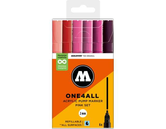 A Molotow ONE4ALL típusú 127HS akril pumpás marker szabványos cserélhető 2 mm-es heggyel rendelkezik, és 2024-től 74 színben kapható, s újratölthető. Nagy fedőképességgel rendelkezik, tartós és szinte minden felületen UV-álló. Akár szörfdeszkára, vászonra, hűtőre, graffitire vagy tornacipőre festesz: semmi sem lehetetlen. Nem hiányozhatnak egyetlen művész felszereléséből sem!
