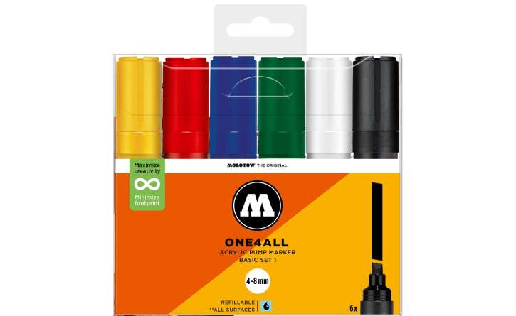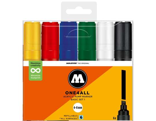 Ez a készlet 6 db ONE4ALL™ 327HS akril markert tartalmaz vágott 4-8 mm-es heggyel. Átlátszó, visszazárható tasakba csomagolva, termékinformációkkal.