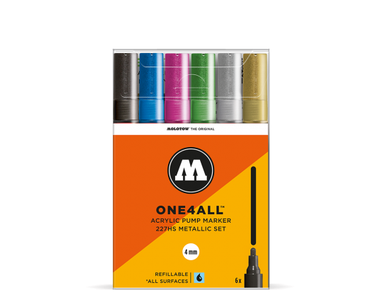 A készlet 6 x ONE4ALL™ neonszínű 227HS markert tartalmaz, átlátszó dobozba csomagolva kapható, elő- és hátlapon termékleírással.