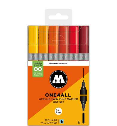 A Molotow ONE4ALL 2024-től 74 színben kapható, újratölthető. Nagy fedőképességgel rendelkezik, tartós és szinte minden felületen UV-álló. Akár szörfdeszkára, vászonra, hűtőre, graffitire vagy tornacipőre festesz: semmi sem lehetetlen. A hatékony színek (fluoreszkáló és fémes) sokkal vonzóbbá teszik a színezést. Nem hiányozhatnak egyetlen művész felszereléséből sem!
