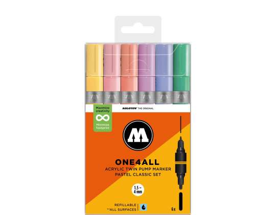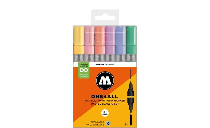 A Molotow ONE4ALL 2024-től 74 színben kapható, újratölthető. Nagy fedőképességgel rendelkezik, tartós és szinte minden felületen UV-álló. Akár szörfdeszkára, vászonra, hűtőre, graffitire vagy tornacipőre festesz: semmi sem lehetetlen. A hatékony színek (fluoreszkáló és fémes) sokkal vonzóbbá teszik a színezést. Nem hiányozhatnak egyetlen művész felszereléséből sem!