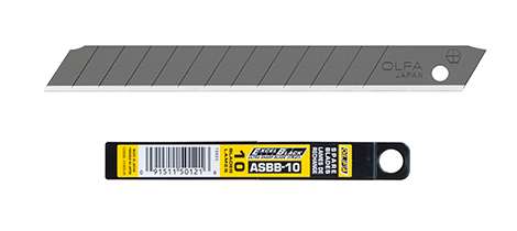 OLFA ASBB-10 - 9mm-es standard, edzettacél tördelhető penge. A következő standard késekhez alkalmazható: SPC-1, S, 180 Black, ES-1/green, A-1, A-2, A-3, A-5, 300, NA-1, SVR-1, SVR-2, PA-2 és XA-1.