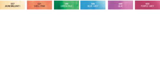 557 Jaune Brilliant 1, 521 Shell Pink, 586 Green Pale, 614 Blue Grey, 649 Lilac, 650 Purple Grey