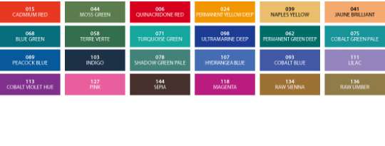 015 Cadmium Red, 044 Moss Green, 006 Quinacridone Red, 024 Permanent Yellow Deep, 039 Naples Yellow, 041 Jaune Brilliant,