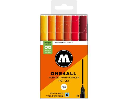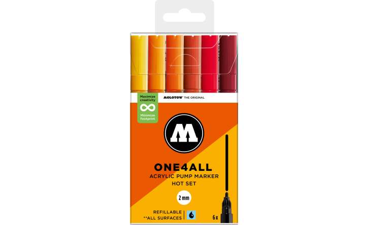 The ONE4ALL 2 mm acrylic markers are available in practical 6 pcs. sets. The sets are suitable for beginners and small art projects on paper, canvases or other surfaces. In a total, there are 74 ONE4ALL color shades.