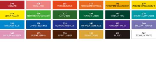 Titanium white, Black, Burnt Sienna, Yellow Ochre, Carmine, Vermilion Hue, Permanent Orange, Permanent Yellow Deep, Permanent Yellow Light, Naples Yellow, Viridian Hue, Sap Green, Permanent Green Light, Phthalocyanine Blue, Ultramarine Blue, Cobalt Blue Hue, Brilliant Blue, Bright Aqua Green, Permanent Violet, Brilliant Purple, Midium Magenta, Coral Red