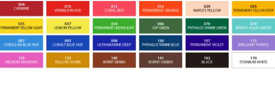 004 Carmine, 010 Vermilion Hue, 012 Coral Red, 016 Permanent Orange, 029 Naples Yellow, 033 Permanent Yellow Deep, 035 Permanent Yellow Light, 037 Lemon Yellow,