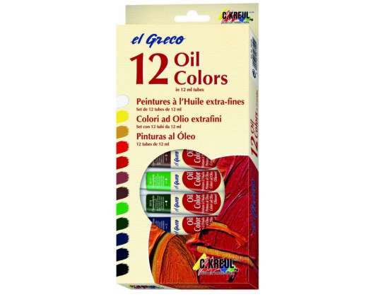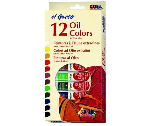 12 ml Titanium White, Cadmium Yellow, Lemon, Light Ocher, Vermillion Red, Carmine Red, Burnt Sienna, Burnt Umber, Emerald Green, Viridian Green, Ultramarine Blue, Cobalt Blue deep, Black