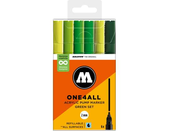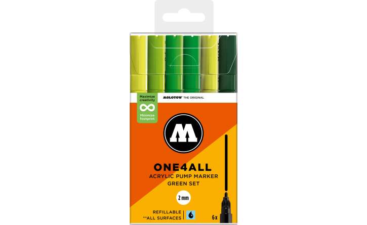 A Molotow ONE4ALL típusú 127HS akril pumpás marker szabványos cserélhető 2 mm-es heggyel rendelkezik, és 2024-től 74 színben kapható, s újratölthető. Nagy fedőképességgel rendelkezik, tartós és szinte minden felületen UV-álló. Akár szörfdeszkára, vászonra, hűtőre, graffitire vagy tornacipőre festesz: semmi sem lehetetlen. Nem hiányozhatnak egyetlen művész felszereléséből sem!