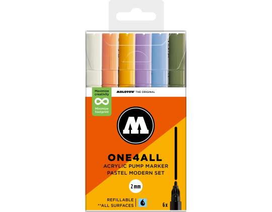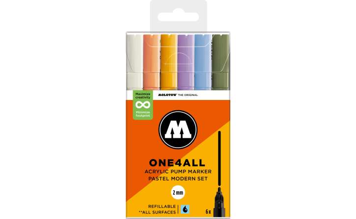A Molotow ONE4ALL típusú 127HS akril pumpás marker szabványos cserélhető 2 mm-es heggyel rendelkezik, és 2024-től 74 színben kapható, s újratölthető. Nagy fedőképességgel rendelkezik, tartós és szinte minden felületen UV-álló. Akár szörfdeszkára, vászonra, hűtőre, graffitire vagy tornacipőre festesz: semmi sem lehetetlen. Nem hiányozhatnak egyetlen művész felszereléséből sem!