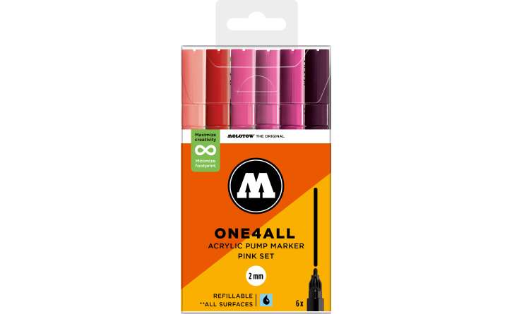 A Molotow ONE4ALL típusú 127HS akril pumpás marker szabványos cserélhető 2 mm-es heggyel rendelkezik, és 2024-től 74 színben kapható, s újratölthető. Nagy fedőképességgel rendelkezik, tartós és szinte minden felületen UV-álló. Akár szörfdeszkára, vászonra, hűtőre, graffitire vagy tornacipőre festesz: semmi sem lehetetlen. Nem hiányozhatnak egyetlen művész felszereléséből sem!