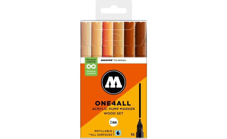 A Molotow ONE4ALL típusú 127HS akril pumpás marker szabványos cserélhető 2 mm-es heggyel rendelkezik, és 2024-től 74 színben kapható, s újratölthető. Nagy fedőképességgel rendelkezik, tartós és szinte minden felületen UV-álló. Akár szörfdeszkára, vászonra, hűtőre, graffitire vagy tornacipőre festesz: semmi sem lehetetlen. Nem hiányozhatnak egyetlen művész felszereléséből sem!