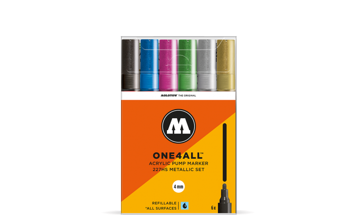 A készlet 6 x ONE4ALL™ neonszínű 227HS markert tartalmaz, átlátszó dobozba csomagolva kapható, elő- és hátlapon termékleírással.