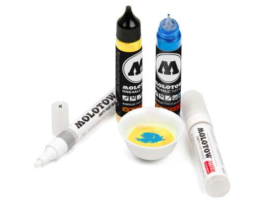 50 különböző színnel a ONE4ALL™ akril festékkészlete a piac legterjedelmesebb akril színskáláját kínálja. Különösen kitűnik a festék azon tulajdonsága, hogy szinte az összes felületen tökéletesen fed. Nem számít, hogy markerrel, ecsettel, pecséttel vagy airbursh pisztollyal használják. A színek UV ellenállók. A 30 ml-es újratöltőpalack tökéletes azoknak akik kicsiben szeretnék elkezdeni. Az újratöltő nem csak a ONE4ALL™ markerhez használható, hanem önálló festőeszközként is használatos.