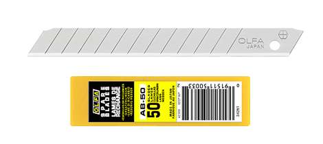 OLFA AB-50 - 9mm-es standard tördelhető penge. A következő standard késekhez alkalmazható: SPC-1, S, 180 Black, ES-1/green, A-1, A-2, A-3, A-5, 300, NA-1, SVR-1, SVR-2, PA-2 és XA-1.