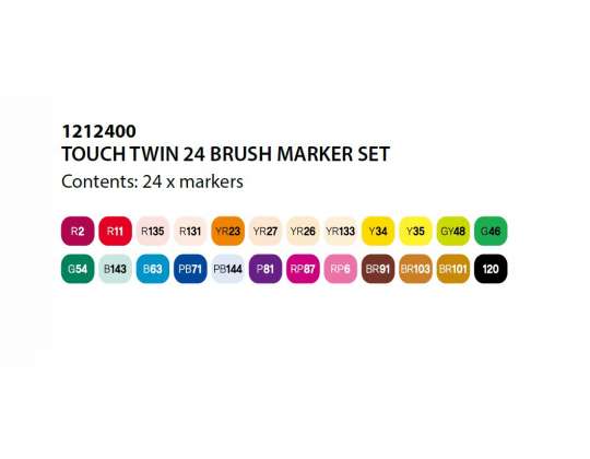 A TOUCH™ Brush Marker 204 színben kapható, kiváló minőségű alkohol alapú tintákkal. Ezek a tinták nem oldják fel a tonertintát a nyomtatott papíron, ami lehetővé teszi a felhasználó számára, hogy átlépje a vonalakat anélkül, hogy a tinta megfolyna, és rétegezési technikák alkalmazásakor nem szennyezik az alatta lévő színeket. A színek az egészen halványtól az élénkig terjednek, több színprizmában.